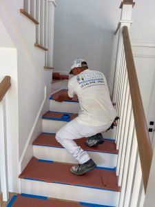 Detailed stairway preparation and surface protection by Laguna Painting before interior painting.